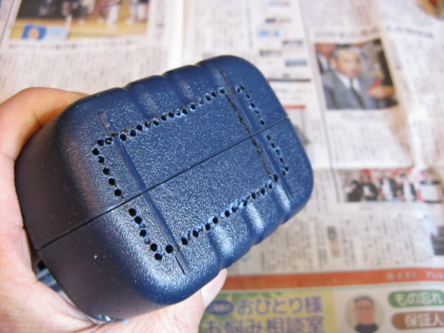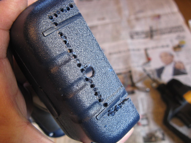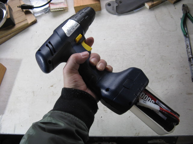 次にドリルドライバーの本体の追加工です。 電池ボックスに合った開口を作ります。まずは油性ペンで切断部を書いて、そこにφ2の穴をミシン目のように開けていきます。 まずはφ2のキリでザグリをしていきます。対象が固い時はザグリが重要と思っています。 作業のポイントは掃除機でこまめに掃除をしながらするようにしています。気持ちがはやるとケガの原因にもなりますので。