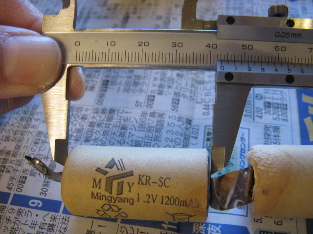 寸法を測るとL43mm、直径φ22.5mmのサブCという電池という事が分かりました。電動子具やラジコンに多く使われている電池という事でした。