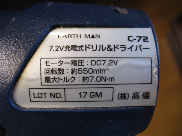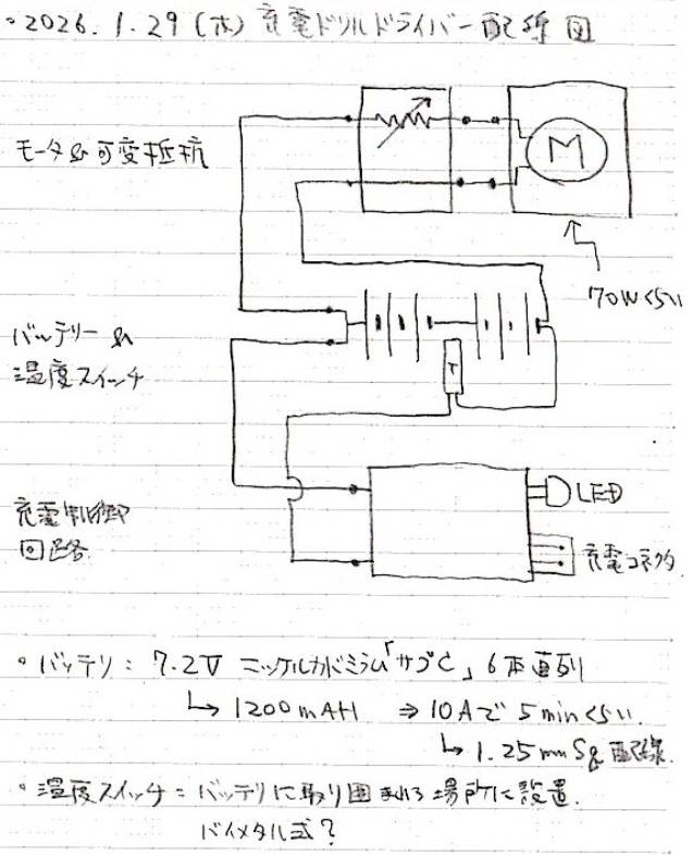 サブC電池のタブ付きを6本購入して、それをハンダで結合させて電池をしっかり復旧することも考えましたが、そこまでのパワーはかけずに、安全に動くようにすることを目標にしました。 という事で、充電と放電を切り離して、充電は充電で行い、放電というか電力を利用するときはバッテリーを本体に取り付ける方式にすることにしました。 サブCというのは10Aくらいの大電流を流せるもののようで、7.2Vの直流だとモーターでは70Wを消費していて、人間の並みの力なので、現実にあっていると思いましたし、電池容量も5分くらいで、言われてみるとそんなに長い時間の作業には使えなかったとも思い、納得しました。 銘板では7N・mで550rpmとあり、そのまま計算すると出力は約400Wです。これは少し、大きな数字なのかな?と思いました。 想像ですが、トルクはドリルビットを回転させる最大のトルク値で、回転数はドリルビットを回転させる最大の回転数と推測しています。