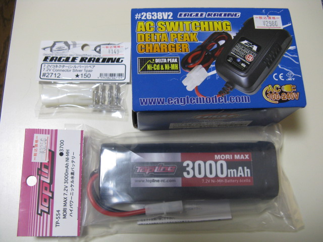 さて、流れる電流は10A程度としましたので配線の太さは1.25mmSqのものが必要のようです。 充電はラジコン用の電池と充電器を使うことにしましたので、港区木場町のラジコン屋さんでニッケル水素電池(3k円強)と充電器(3k円弱)、コネクタを購入しました。