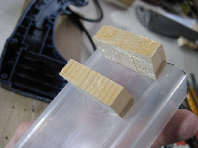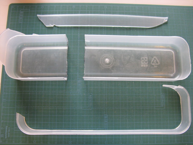 次にバッテリーケースの製作です。 バッテリーは44mm×24mm×150mmなので、それを収容できる寸法ののものを探しました。 「押し入れ除湿」の空き容器が寸法的に合っていまして、カッターナイフで切り出しました。