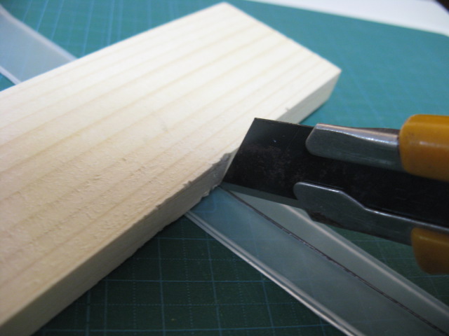刃の折り取り面を板に当てて、テコの原理で刃を進めます。1回で1mmくらいでしょうか。こうすると滑って手を切るとかがありません。 1mmくらい進めるのを100回すると10cm進みます。コツコツすると何事も進んでいきます。こうして溝を掘っていくイメージです。