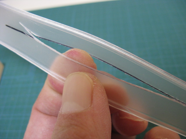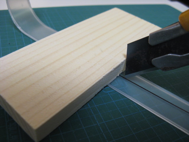 材質はポリプロピレンで厚みは1.0mmです。カッターの刃がツルツルすべるので作業がしにくいです。 そうしたときは「テコ切り」という切り方をしています。 切る線に対して直角にかまぼこの板などを置きます。板と対象が動かないように押さえながら、切っ先を対象に厚みの半分くらいのイメージで刺します。