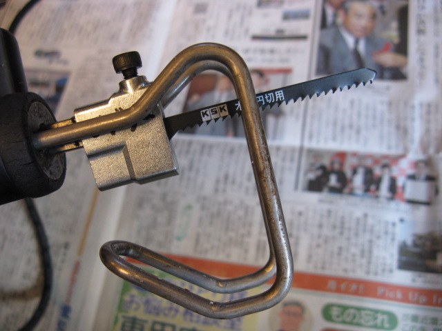 ジグソー刃のレシプロソーへの取り付けの写真です。今回の刃はKSKの「木工円切り用」です。