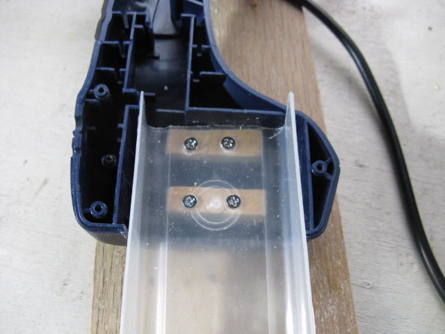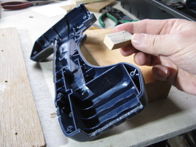 再び、先ほどの木ネジを避けるようにφ2キリで穴を本体まで貫通させます。今度は本体の外側から丸小ねじ3×10で本体と木材を固定します。これで電池ボックスが本体に固定されました。 本体内に、モーター、減速機、トリガースイッチを元あったように設置します。